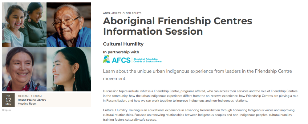 Tuesday, April 28 – Learn about Friendship Centres and the urban Indigenous context. Discussion topics include: what is a Friendship Centre, programs offered, who can access their services and the role of Friendship Centres in the community, how the urban Indigenous experience differs from the on-reserve experience, how Friendship Centres are playing a role in Reconciliation, and how we can work together to improve Indigenous and non-Indigenous relations.